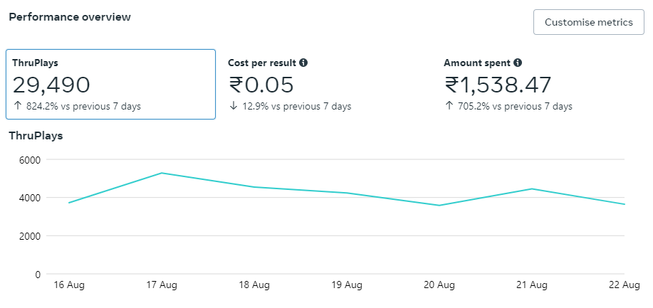 Got 29k+ ThruPlays with an amount spent of around Rs 1.5k from Video Views Engagement Campaign.